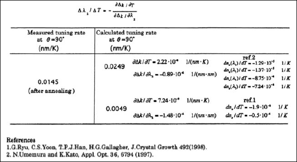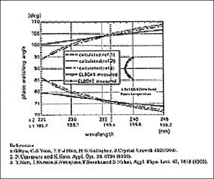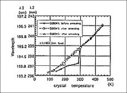 公表されているCLBOのセルマイヤー方程式[1],[2]を用いるとNd:YAGレーザーの 基本波波長(1064.21nm)と236.4nm光との和周波混合によっておよそθ=76°で位相整合し,ArFレーザと同一の波長の193.4nm光が発生できると計算されるにもかかわらず,上記2波長の組合せでは,図1に示すように室温で全く位相整合しないことを実験的に確認した.実験にはTSSG法で育成されたを用いたNd:YAGレーザの基本波波長を固定し,もう一方の波長を変えた実験によって室温(23°)では1064.21nmと238.8nmとのSFMにより195.0nm発生でnon-critical位相整合することがわかった。また,CLBOの結晶温度を変えた実験では,NCPMによってArFエキシマーレーザ波長に対応する193.39nm光を発生するには,CLBO温度を約-185°Cに冷却する必要があることを見出した(図2)。また,上記公表されたセルマイヤー方程式とdn/dTから計算されたtuning rate dλ/dTは実験的に得られたtuning rateと大きく異なった。さらに,結晶温度0°C付近でtuning rateが大きく変化する試料も存在することが実験的に確認できたが,現在,この原因はあきらかではない.