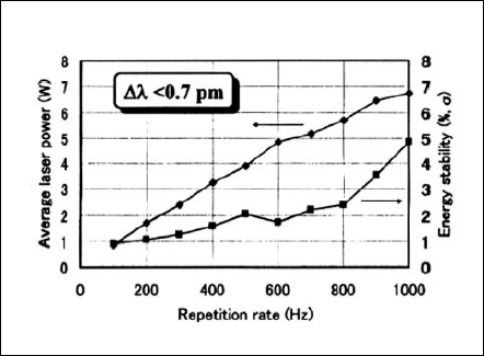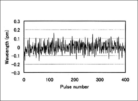 The line-narrowing optics in this laser consists of a combination of prism beam expanders and a grating. Figure 1 shows a spectral profile measured by an etalon system with a FSR of 6 pm and a reflection finesse of about 30. Figure 2 shows an ingegrated energy distribution. More than 5 mJ of pulses with of below 0.6 pm FWHM and 95% of the spectral energy lying within a 2 pm were obtained. The laser output stability and the spectral stability will be also presented.
