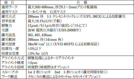 従来のプリント配線板に使用される露光方式は、拡散光あるいは平行光による密着露光が主流であった。この従来方式では、マスクにレジストが付着(液状レジスト、ソルダーレジストの場合)するため、マスクダメージ回避(マスク交換)によるランニングコスト上昇、基板のパターン欠損による歩留り低下が問題となっていた。