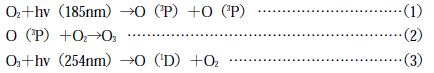 水銀の共鳴線185nm光は(1)(2)式の反応で空気中の酸素からオゾンを生成し、254nm光はこのオゾンを分解して活性な原子状酸素O(1D)を生成する((3)式)。これと同時に185nm光および254nm光は汚染物質である有機物の化学結合を切断する。この化学結合を切断された有機物に、オゾンや活性原子状酸素が作用し、有機物が酸化分解されて低分子状の物質となり、揮発するといわれている2)