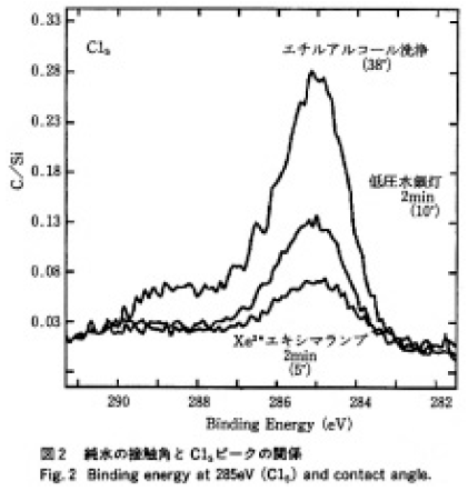 被洗浄試料として石英ガラス(GE 社製GE-214)を使用した。このガラスをエチルアルコール洗浄したのち、大気中に放置して有機物を付着させた。純水の接触角はエチルアルコール洗浄を行った場合は38°、低圧水銀ランプで2分間洗浄した場合は10°、エキシマ光照射で2分間洗浄した場合は5°になった。