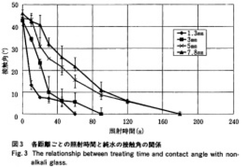 図3に測定結果を示す。照射窓面から無アルカリガラスまでの距離が小さいほど、急速に洗浄された。照射距離5.0mm と7.8mm における洗浄効果は、接触角10°以下においては同一になったが、この理由は不明である。