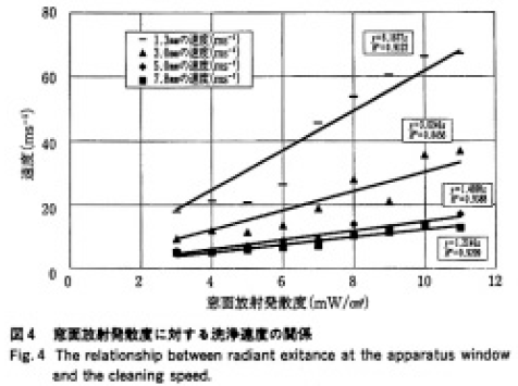 図4に窓面放射発散度と洗浄速度の関係を示す。図中の直線と方程式は、洗浄速度(y)が窓面放射発散度(x)に比例すると仮定し、最小二乗法から求めたものである。各照射距離において、実験結果は直線と比較的よく一致して、洗浄速度は窓面照射発散度に比例している。