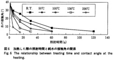 純水の接触角が40°から10°になるまでの時間を図3から求め、この逆数を洗浄速度の目安とした。表2に照射距離1.3mm の値で規格化した洗浄速度を示す。洗浄速度は、照射距離が1.3mm に比較して、3.0mm の場合には0.52倍、5.0mm の場合には0.21倍に減少した。