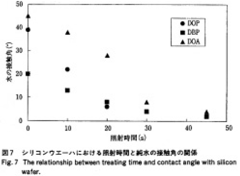 図7に結果を示す。純水の接触角は急激に下がる。30秒間から45秒間程度でプラスチックに含まれる可塑剤が洗浄できることが明らかになり、シリコンウエーハでもUV/O3洗浄の効果が確認できた。