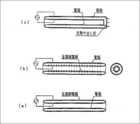 図1(a)は、外側誘電体管を石英ガラスにし、外側電極を光透過性の金属網にして、外側管の側面から光を取り出す方式にした管状エキシマランプである。