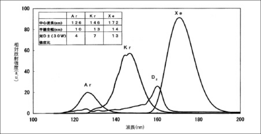 エキシマ光の中心波長入および半値全幅△ λは、Ar2*ではλ=126nm、△ λ=10nm、Kr2*ランプではλ=146nm、△ λ=13nm、Xe2*ランブではλ=172nm、△ λ=14nm が得られた。