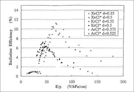 放電管は図1(a)の管状ランプ、放電用ガスは希ガスとCl2の混合ガス、管壁負荷は0.1~0.5Wcm-2の範囲という条件において、換算電界強度E/pと電気入力のエキシマ光への変換効率との関係が調べられている。その結果を図4に示す。13)電界強度E は、実測した放電維持電圧を放電ギャップ長dで除したもので、E/pは放電ギャップ長dと放電ガスの圧力pを変えることよって変化させた。放電ギャップ長dと放電ガスの圧力pを変えてE/pの最適化を図ることにより、容易に効率を最大に出来る。