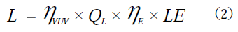 ここで、kmは最大視感度683lm/W、V(λ)は標準視感度である。LEは、今回使用したLAPについては、発光スペクトルの解析から510lm/Wとした。(2)式の右辺にアパーチャからの光取り出し効率Kを乗じることで、L、QL、ηE、LEが既知であれば、(4)式より、ηVUVを求めることができる。