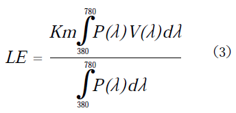 ここで、ηVUV は、VUV光のランプ入力に対する変換効率、QLは、ランプ内部の蛍光体の量子効率、ηEは、エネルギー変換率で、真空紫外光のフォトンエネルギーと蛍光のフォトンエネルギーの比であり、今回は、0.31とした。LEは蛍光体のルーメン当量で、次式(3)によって与えられる。