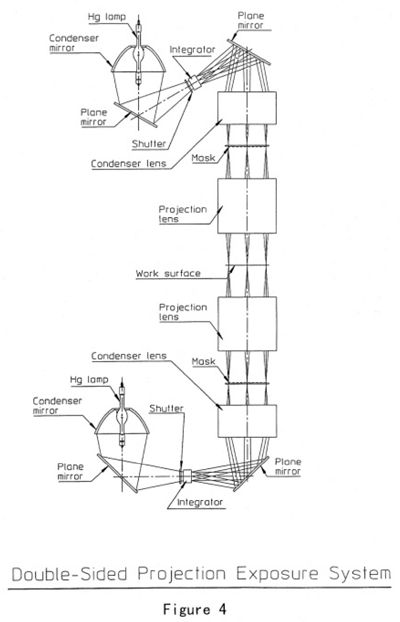 両面同時投影露光機は投影レンズとマスクがワークの両面におのおの配置されている。両面露光のメリットは露光現像の工程数が片面り場合の約半分になることです。実際にはパワートランジスタのパターニングや水晶振動子の加工、インクジェットプリンタヘッド加工などに用いられている。