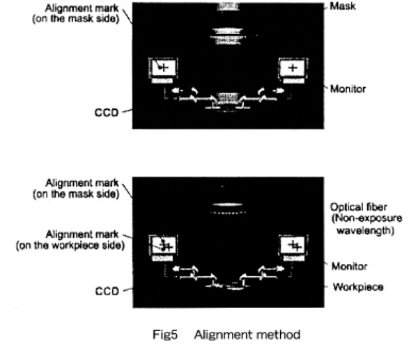 This alignment method allows direct observation of the alignment marks on the work-piecewith the CCD camera. It also eliminates reduction in the contrast caused by observation ofthe alignment marks through the mask, thus allowing high-precision alignment with clearalignment marks. In addition, instead of requiring a through-hole for alignment, it allowsalignment with the alignment marks formed on the work-piece surface.