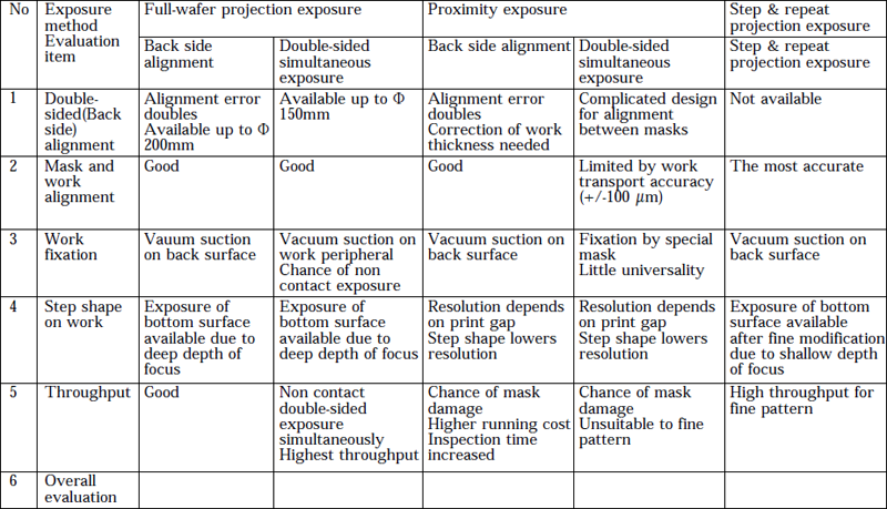 一括投影露光装置は破損しやすいワークの非接触露光や段差のあるワークヘの露光工程への適用に適する。しかし、その間題点は総合重ね合せ精度である。総合重ね合わせ精度の実用的範囲はΦ150mm 程度でおおよそ±2から3µmが限界と考える。また、プロキシミティー/コンタアクト方式の場合はマスクとワークの連続欠損(歩留まり)の発生が間題となる。半導体用ステッパーは裏面アライメント機能がない。しかし片面に高い重ね合わせ精度や高解像力が要求される場合には選択せざるを得ない。