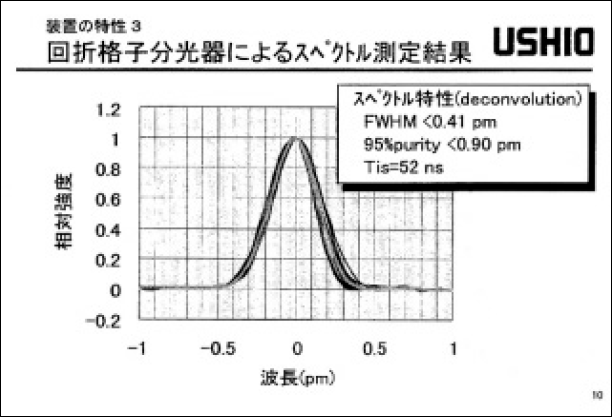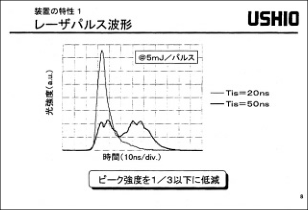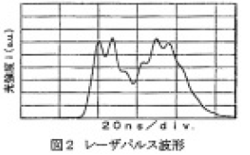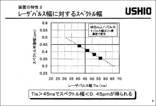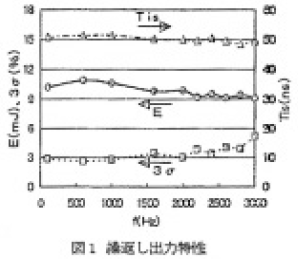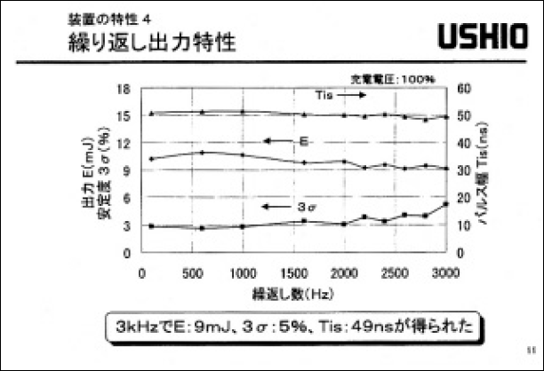 図1に繰返し出力特性(印加電圧100%時)を示す出力エネルギーをE、出力安定度を3σ、レーザーパルス幅をTis(=[∫I(t)dt]2/∫I2(t)dt、Iは光強度)で示している。3kHz においてE: 9mJ、3σ: 5%、Tis: 49nsが得られた。図2に典型的なレーザーパルス波形を示す。パルス幅をTis 半で50ns 程度まで伸長させたことにより、ピーク強度は1/3以下に低下した。スペクトル幅は半値で0.4pm以下、95%エネルギー積算で0.9pm以下が得られた。