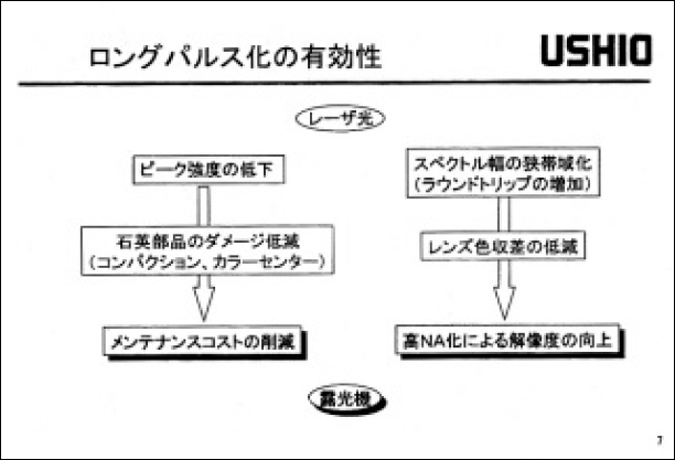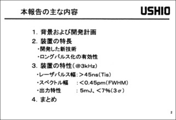 ArF エキシマレーザーは、0.13µmルール対応の次世代露光用光源であり、その性能向上に向けた開発が現在活発に進められている。我々は、これまでに2kHz ArFエキシマレーザーの基本特性を実証したことを報告している1)。今回、さらに高スループット化に対応すべく、3kHz ArFエキシマレーザーを開発し、その基本特性を実証したので報告する。本レーザー装置は、レーザーパルス幅を従来の3倍程度に伸長させており、その結果、露光機の石英部品へのダメージ低減、および超狭帯域化による解像度の向上を可能にしている。