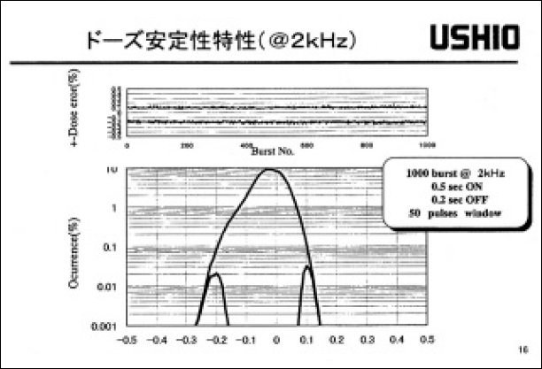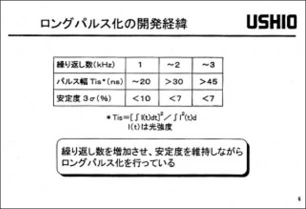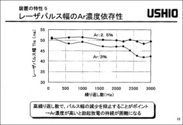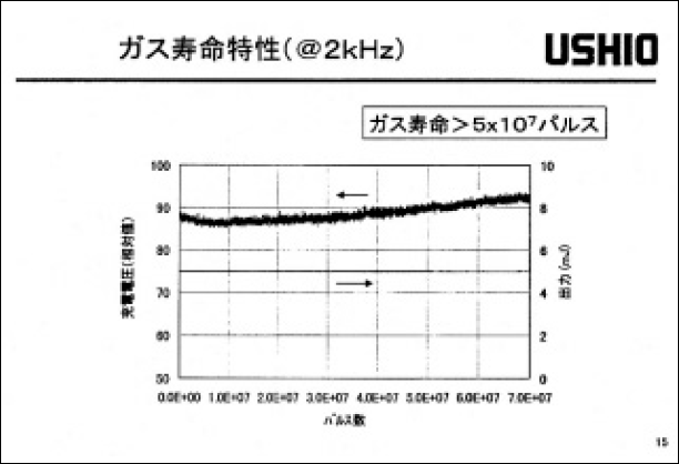 以上により、均一放電の長時間持続(100ns程度)、およぴ低クリアランスレシオ(2以下)を実現し、レーザー発振効率を低下させること無く、ロングパルスでの高繰返し勤作を達成している。また、レーザーガス中の不純物量の管理、放電ダストの発生低減およぴ高効率除去などにより、ガス寿命5x107パルス、チヤンパー寿命109パルス以上も合わせて実現している。