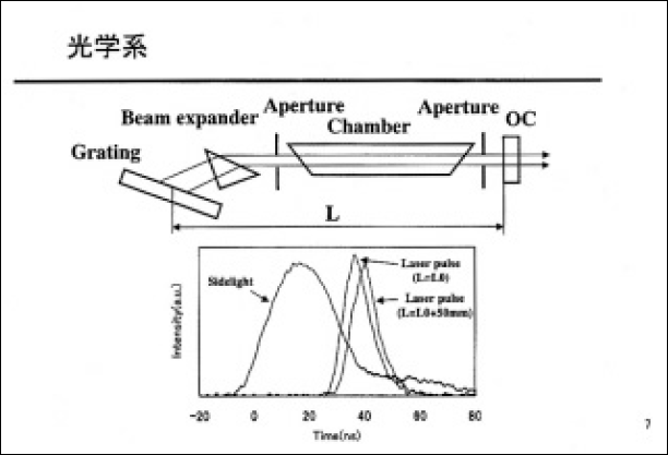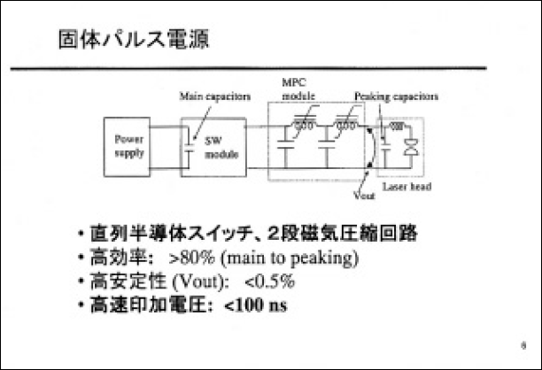 開発した装置には、高繰り返し時における放電の不均一性を低減するために、発光量、均一性の改善を計った誘電体バリア放電予補電離、高速ガス流チャンバを採用するとともに、電極間に100ns の高遠な高電圧を印加可能な個体パルス電源を搭載した。
