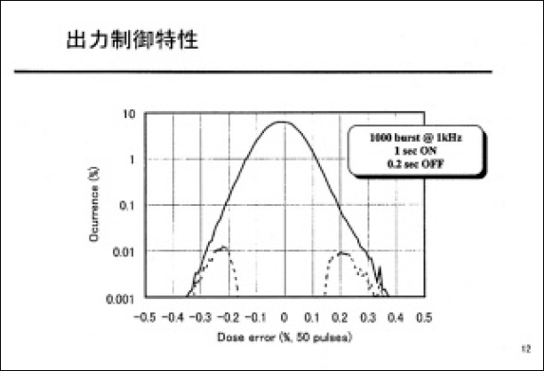 図1に繰り返し周波数に対する出力特性、図2に5mJ@1kHz動作における出力制御結果を示す.放電の均一化を行った結果、1kHz 以上の繰り返し周波数においても、出力は増加し、2kHzの動作において12Wを得ることができた。更に、1kHz動作の移動積算値において、±0.3%(50パルス)と十分な高安定性を実証することができた。今後、放電回路部等の改良により、更に高出力及び高安定化を目指す予定である。