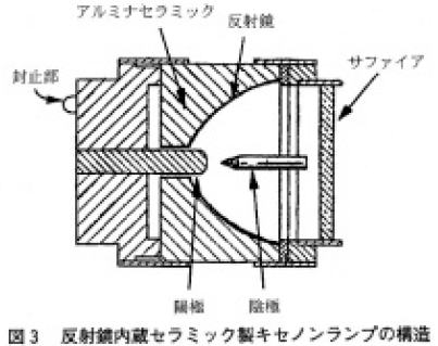 セラミック製キセノンランプの特徴は,石英ガラス製キセノンランプに比較して効率は低いが,反射鏡まで含めた大きさを考慮すると,光源が小型軽量になる利点がある。また反射鏡の口径が小さいため光学系を小さくできる利点もある。セラミック製キセノンランプには破裂の可能性がないことも特長である。
