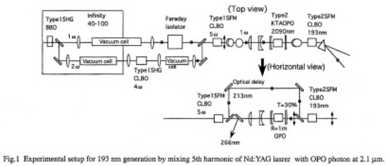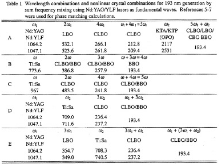 波長変換によってAfF エキシマーレーザーと同一の波長193.4nmを発生させる諸方式の内,基本波レーザーとしてNd:YAG,Nd:YLF、およびTi:Al2O3レーザーを仮定した場合について考える.Table1に有望と思われる非線形結晶とそれらを用いて計算上位相整合可能な和周波波長の組合せの代表例を示した.これらの内,BBOはTable 1 に示したすべての方式の最終段で位相整合するが193nm領域での吸収が大きく1)高平均出力の193nmの発生には不利である.先ず,方式Aは基本波レーザーの5倍波と21µm帯OPO光との和周波混合方式である.最終段の結晶としてはCLBO,LBO,CBO,BBO が位相整合する.OPOが発振する遅れ時間が生じるため,何らかの同期調節が必要である.方式Bは,Ti:Al2O3レーザー(773.6nm)の4倍波によって193nmを得ようとするもので,計算上非線形光学係数も大きく,方式Aのような同期調節も不要であり,一見有利であるが,上述のようにBBOの193mm領域での吸収が大きく高平均出力の発生には不利である.方式Cは,Ti:Al2O3 レーザー(967nm)の5倍波によって193nmを得ようとするもので,最終和周波段にはBBO 以外にCLBOも,文献5-7)のセルマイヤー方程式を用いた計算では位相整合し(実験的には未確認),方式Aのような同期調節も不要であるが,基本波であるTi:Al2O3レーザーの発振波長が利得中心から200nm以上ずれており総合的な変換効率の低下は否めない.