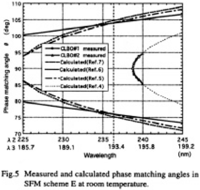 1999年2月のASSL会議にてUmemuraら4)がCLBOの新しいセルマイヤー式を報告するまでは,少なくとも3つの異なる機関から報告されたCLBOのセルマイヤー式5-7)のいずれを用いても,Table 4にあげた波長の組み合わせの和周波混合によって室温で計算上位相整合することが知られていた.しかし,実際に実験してみるとTable 4 に示した波長の組み合わせでは室温で位相整合しないことが明らかとなった2).実験系をFig.4 に示す.λ1を1064.2nmに固定の状態でTi:Al2O3の波長を変えてλ2を可変にした.各波長はBurleigh社の波長計,WA4500 及びWA5500 で実測された.Ti:Al2O3の波長同調と狭帯域化は共振器内におかれた4個の分散プリズムと0.7mm厚のガラス板の回転によって行った.λ1の光源装置は縦,横単一モードのMOPA構成で,マス夕一発振器の共振器長は温度制御されており,約1週間の連続波長計測でもその安定度は高く,resettabilityを含めて10-6以下であった.テストしたCLBOは社内製のもの,国内メーカーの市販品の2種類を用いたが,いずれも室温(24°C)ではTable 4 に示した波長の組み合わせでは位相整合せず,λ1=1064.21nm,λ2=238.75nm,λ3=195.00nm の波長の組み合わせで90°位相整合(NCPM)することがわかった.この結果は最も新しいと思われるセルマイヤー式(文献4)の式(2))を用いた計算結果とよく一致した(Fig.5).なお,この時の基本波入力は合計287mJ,195nm出力は約1.2mJで,光-光の総合効率は0.56%で期待値(4%以上)を大きく下回った.2種の異なったレーザーを用いたため,パルス幅が一致していない(λ1:3.5nsec,λ2:10nsec)ことがその主因であるがその他にTi:Al2O3レーザーのjitterが大きかった(3nsec以上)こともあげられる.実機ではTi:Al2O3レーザーヘのseedingにより,jittefの原因であるbuildup timeの安定化が必要である.