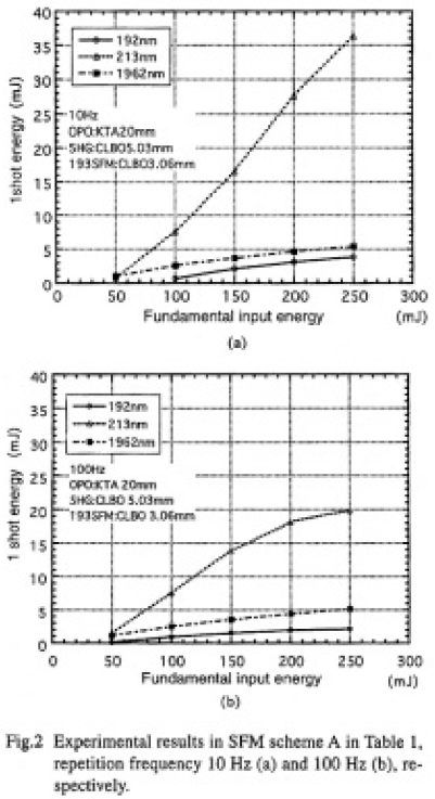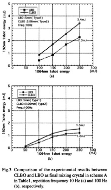 次に最終和周波段の結晶をCLBOからLBOに代えて比較実験を行った.諸パラメータの比較をTable 3に,実験結果をFig.3(a),(b)に示す.10Hz,100Hzいずれの場合にもCLBOの方が大きな出力が得られた.Table 3 に示したようにLBOのdeffが小さいためLBO の結晶長をCLBO より長くしたが,それでもなおdriveの大きさの点ではCLBOの方が約1.7 倍大きく,また,LBO が長い分だけスペクトル許容幅,温度許容輻のいずれの点でもCLBO が有利となる条件となった.これらの理由によりCLBOで大きな出力が得られたと考えられる.