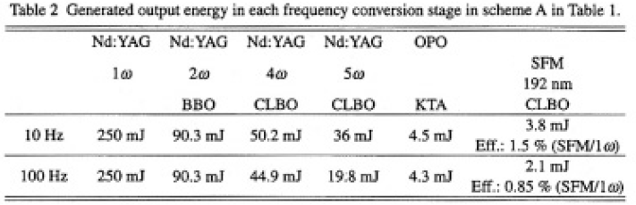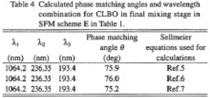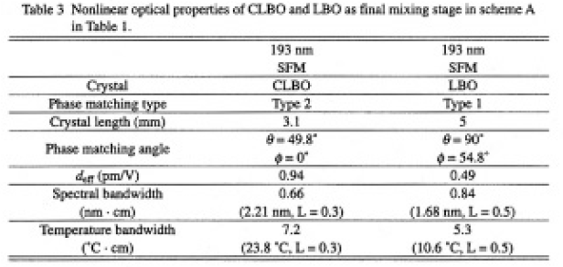 波長変換によってAfF エキシマーレーザーと同一の波長193.4nmを発生させる諸方式の内,基本波レーザーとしてNd:YAG,Nd:YLF、およびTi:Al2O3レーザーを仮定した場合について考える.Table1に有望と思われる非線形結晶とそれらを用いて計算上位相整合可能な和周波波長の組合せの代表例を示した.これらの内,BBOはTable 1 に示したすべての方式の最終段で位相整合するが193nm領域での吸収が大きく1)高平均出力の193nmの発生には不利である.先ず,方式Aは基本波レーザーの5倍波と21µm帯OPO光との和周波混合方式である.最終段の結晶としてはCLBO,LBO,CBO,BBO が位相整合する.OPOが発振する遅れ時間が生じるため,何らかの同期調節が必要である.方式Bは,Ti:Al2O3レーザー(773.6nm)の4倍波によって193nmを得ようとするもので,計算上非線形光学係数も大きく,方式Aのような同期調節も不要であり,一見有利であるが,上述のようにBBOの193mm領域での吸収が大きく高平均出力の発生には不利である.方式Cは,Ti:Al2O3 レーザー(967nm)の5倍波によって193nmを得ようとするもので,最終和周波段にはBBO 以外にCLBOも,文献5-7)のセルマイヤー方程式を用いた計算では位相整合し(実験的には未確認),方式Aのような同期調節も不要であるが,基本波であるTi:Al2O3レーザーの発振波長が利得中心から200nm以上ずれており総合的な変換効率の低下は否めない.