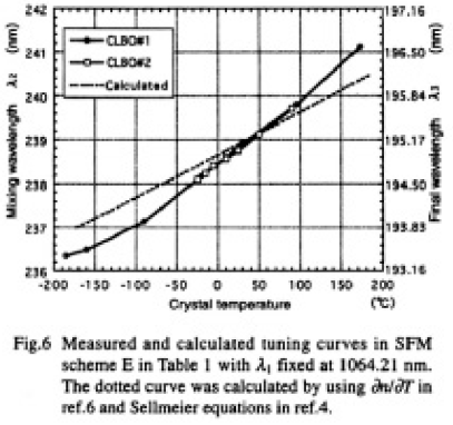 1999年2月のASSL会議にてUmemuraら4)がCLBOの新しいセルマイヤー式を報告するまでは,少なくとも3つの異なる機関から報告されたCLBOのセルマイヤー式5-7)のいずれを用いても,Table 4にあげた波長の組み合わせの和周波混合によって室温で計算上位相整合することが知られていた.しかし,実際に実験してみるとTable 4 に示した波長の組み合わせでは室温で位相整合しないことが明らかとなった2).実験系をFig.4 に示す.λ1を1064.2nmに固定の状態でTi:Al2O3の波長を変えてλ2を可変にした.各波長はBurleigh社の波長計,WA4500 及びWA5500 で実測された.Ti:Al2O3の波長同調と狭帯域化は共振器内におかれた4個の分散プリズムと0.7mm厚のガラス板の回転によって行った.λ1の光源装置は縦,横単一モードのMOPA構成で,マス夕一発振器の共振器長は温度制御されており,約1週間の連続波長計測でもその安定度は高く,resettabilityを含めて10-6以下であった.テストしたCLBOは社内製のもの,国内メーカーの市販品の2種類を用いたが,いずれも室温(24°C)ではTable 4 に示した波長の組み合わせでは位相整合せず,λ1=1064.21nm,λ2=238.75nm,λ3=195.00nm の波長の組み合わせで90°位相整合(NCPM)することがわかった.この結果は最も新しいと思われるセルマイヤー式(文献4)の式(2))を用いた計算結果とよく一致した(Fig.5).なお,この時の基本波入力は合計287mJ,195nm出力は約1.2mJで,光-光の総合効率は0.56%で期待値(4%以上)を大きく下回った.2種の異なったレーザーを用いたため,パルス幅が一致していない(λ1:3.5nsec,λ2:10nsec)ことがその主因であるがその他にTi:Al2O3レーザーのjitterが大きかった(3nsec以上)こともあげられる.実機ではTi:Al2O3レーザーヘのseedingにより,jittefの原因であるbuildup timeの安定化が必要である.