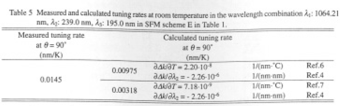 ここで,no,iとne,iは波長λ1における常光線およぴ異常光線に対する屈折率である.公表された屈折率の温度に対する変化率∂n/∂T6)と,最も新しいと思われるセルマイヤー式(文献4)の式(2))とを用いた計算によるtuning rateをFig.6に点線で示した.実験値との比較表をTable 5に示す.この表には文献4)のセルマイヤー式と文献7)の∂n/∂Tとを用いた計算値も示した.いずれの計算値も実験値0.0145nm/°Cとは相違する.上式(2)の分母,即ち式(4)はセルマイヤー式の係数で決まり,分子,即ち式(3)は∂n/∂T で決まる.室温での位相整合が文献4)のセルマイヤー式を用いた計算値と実験値とがよく一致しているので,Table 5における相違の原因は∂n/∂T 値にあると考えられ,文献6,7)のいずれに示された∂n/∂T 値でもここで示された実験結果を説明できない.しかし最近になって梅村らが新しい∂n/∂T を公表した8).これと文献4)の式(2)とを用いた計算によるtuning rateは0.0143nm/°Cとなり実験結果ときわめてよい一致を示した.文献8)の適用温度範囲が室温から110°C程度までとのことであるが,実験結果との比較によると-180°C程度から+200°C程度まで適用可能であると思われる.