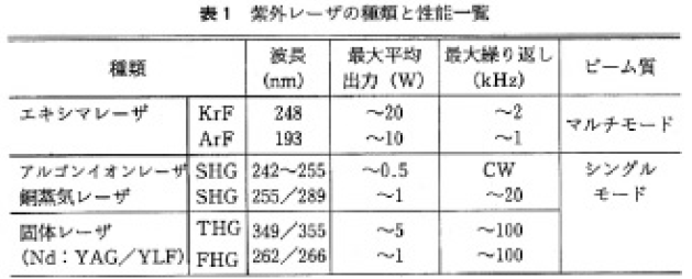 材料としては,赤外レーザでは加工が困難な金属を始めとして,半導体,ガラスなどの絶縁体や誘電体プラスチックに至るほとんどすべての物が対象となりうる。現在,産業用として実際に使われている主な紫外レーザの種類,特徴などを表1に示す。