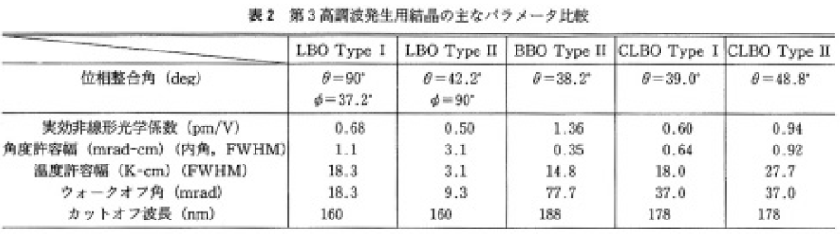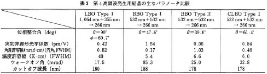 表2に第3高調波発生用,表3に第4高調波発生用非線形結晶の主なパラメータをまとめた。まず,表中項目の意味を簡単に説明する。波長変換を効率的に行うには位相整合が必要で,n3/λ3=n1/λ1+n2/λ2を満たすように結晶のカット角度が決められる。ここで,λ1,λ2は入射光の波長,n1,n2はそれら波長に対応する屈折率,また,λ3,n3は出カ光に対する波長と屈折率である。上記位相整合条件を満たすために結晶の持つ複屈折性が利用される。この式が満たされた場合の波長変換効率は,結晶材料と位相整合角できまる実効非線形光学係数,結晶長,入射光強度の積の2乗に依存して増大する。励起用1µmレーザからの変換効率は,非線形光学結晶の設計寿命などに依存するので一概には言えないが,通常第3 高調波で20~30%,第4高調波で10~20%程度である。