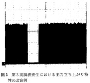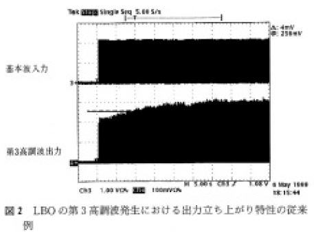 このような不具合を改善する方法としては,低吸収の結晶ないし温度許容幅の広い結晶の適用,結晶温度の安定化制御などが考えられる。図3は,改良を実施した装置における実験結果例を示す。第3高調波特性は,図2と同様の平均出力5W,繰り返し周波数5kHzであるが,出力は速やかな立ち上がりを示している。