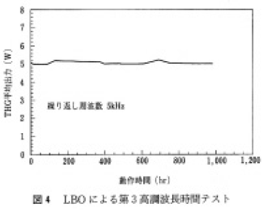 図4に,長寿命動作を主眼とした最適化を行った装置において,LBOにより第3高調波を5W発生させた場合の長時間勤作特性を示す。約1,000時間の動作で出力の滅衰はほとんどなく,さらに結晶位置を移動させて使用することで,実用上十分といえる寿命を得ている。また第4高調波発生に適したCLBOは,LBOについで損傷に強い結晶とされる。当社では,4倍波の1W出力においても約1,000時間の動作を確認しており,さらに結晶位置を移動させて使用することで,このレベルでの実用化の目処が立っている。