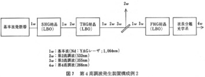 表3に,第4高調波発生が可能な結晶とその主なパラメータを示した。BBOとCLBOは図6に示した第2高調波のさらなる第2高調波発生用として第4 高調波発生できる。LBOは基本波と第3高調波との和周波発生により第4高調波発生ができるが,このため図7に示すように装置構成が複雑となり,結晶の個数もBBO,CLBO適用の場合に比べ1個増え,総合の変換効率は前者に比べ低下する。したがって,LBOは第4高調波発生装置ではほとんど用いられない。