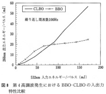 一方,表3のType l BBOは1W程度以下の出力レベルでは現在よく用いられているが,これ以上の出力レベルでの実用で実績がない。図8は筆者らが同一の第2高調波をBBOとCLBOに入射させ,その第4高調波波長変換特性を調べたものである2)。出力が20mJ程度まで,したがって平均出力で2W程度までは,BBOが優っているが,それ以上の出力レベルではBBOで効率が急激に低下し,出力が飽和している。