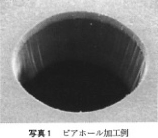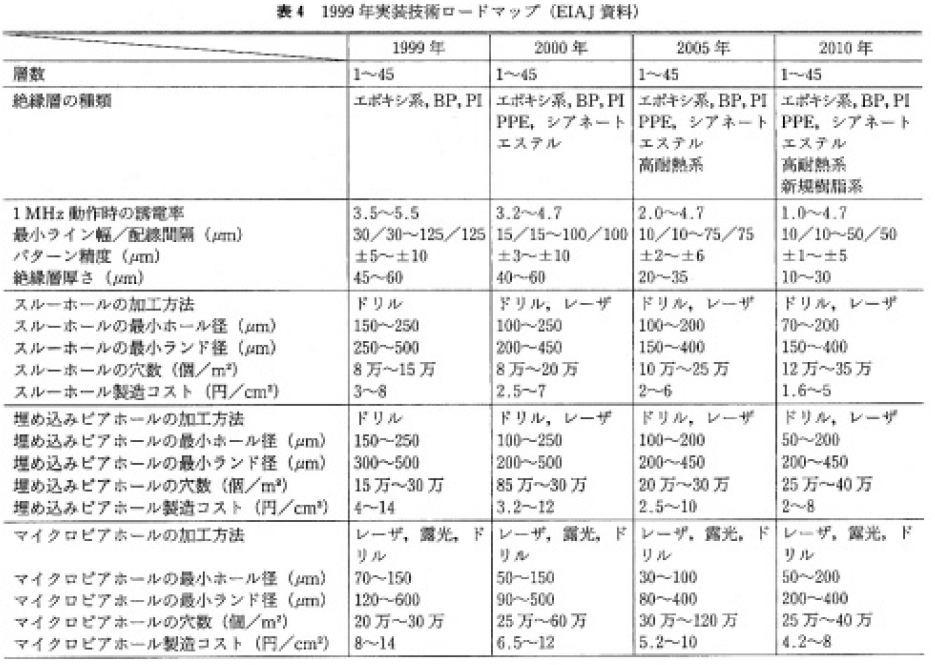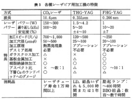 プリント基板のビアホール加工は,従来のCO2レーザから今後は,ガラスクロス基材入りの加工が可能で,微細穴加工ができる紫外線レーザに移行しつつある。EIAJ の今後の実装技術ロ一ドマップを表4,またこれらに使用される各種レーザ加工機の特徴を表5に,加工例を写真1に示す。