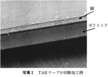 集光性の良い紫外光の特徴を生かし,高ポリイミドフィルムや金属など,従来のレーザでは加工できなかった材料の加エヘの適用例が増加している。第4高調波によるTAB テープの切断加工例を写真2に示す。また,これらの加工特性を生かして,各種材料のトリミング加工にも使用される。