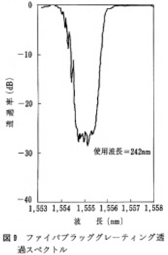 ファイバブラッググレーティング(FBG)は,現状アルゴンレーザの第2高調波,またはKrFエキシマレーザを光源として製作されているが,それぞれ低出カ,干渉性が悪いなどの課題がある。前者よりは高出力で,後者よりは干渉性,繰り返し性の良好な固体レーザ和周波の応用として.FBG製作への展開が期待される。発生波長242nmの和周波より石英ファイバにFBG書き込みを行って得られた透過特性例を図9に示す。課題はあるが,固体レーザがこのような応用に適用可能であることが示された。また,和周波の応用としては193nmまでの半導体検査光源などが期待されている。