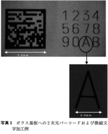 第4高調波によるガラス基板への2次元バーコード印字例を写真3に示す。CO2レーザに比ベクラックが少なく視認性の良い加工が示されている。