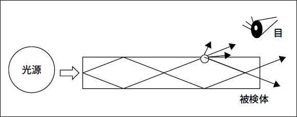TFTやPDPガラスの微妙な表面のキズを見ます。光が検査体の中を通過するとき、キズの部分で乱反射を起こすため、その部分が輝いて見えます。
