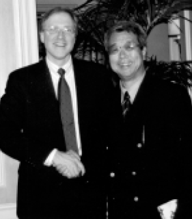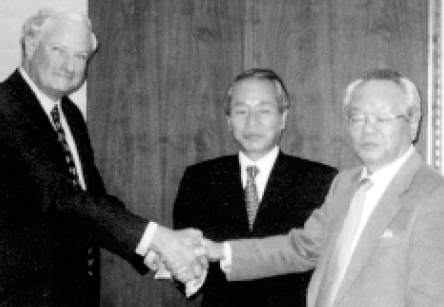 図5-4 今回の契約締結に先立ち、今年2月、当社会長/CEOの牛尾治朗(写真:右)が米国ダラス市のテキサス・インスツルメンツ社を訪ねました。牛尾はトム・エジンバス社長/CEOと会談後、ボブ・イングランド上級副社長/画像事業部門長(写真:左)と契約骨子について協議を行い、基本的合意に至りました。