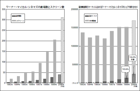 シネマコンプレックスの事業展開を最初に行ってきた、ワーナーマイカルシネマズの劇場数とスクリーン数や国内映画興行マーケットにおけるシェアの移り変わりも参考にしていただきたい。