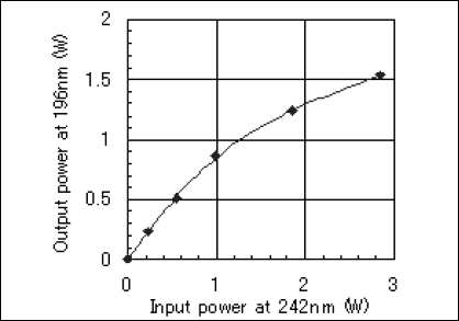 Despite such superiority, solid-state UV lasers have suffered from the significant drawback of rather low output power especially in the DUV region below 200nm. A major breakthrough in the DUV power generated from all-solid state source was achieved with a novel frequency conversion pathway proposed by USHIO. The system was composed of a Nd:YLF master oscillator, power amplifier (MOPA) system, a single-frequency Ti:sapphire laser emitting at 785nm, and four SFM stages. By employing CLBO crystals for two of the SFM stages, generations of 2W at 242nm and 1W at 196nm with a repetition rate of 5kHz were demonstrated [1] ,[2].