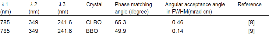 The primary technical challenge in the development is the need to obtain efficient SFM of two beams generated from separated laser systems at high-repetition rates. In general, SFM utilizing the second-order nonlinear optical process is an established method that has been widely applied to up-conversion of visible or infrared radiation into UV and DUV regions. However, most of the previous works utilized dye lasers or Nd:YAG lasers operated at lowrepetition rates, thus the phase-matching limitations such as angular acceptance or walk-off were not the critical issues. Otherwise, the two mixing beams were originated from one laser system, whereby their temporal overlap was automatically fulfilled. In our case, two beams being generated from separated lasers should be created or shaped so as to match both temporal and spatial distributions with respect to each other. Additionally the optimization of the conventional parameters such as crystal length and peak intensities must be considered. As the nonlinear optical to generate the UV at 241.6nm, BBO or CLBO could be employed. Table 3 shows their calculated properties. We chose CLBO from the viewpoint of allowing wide acceptance angle.