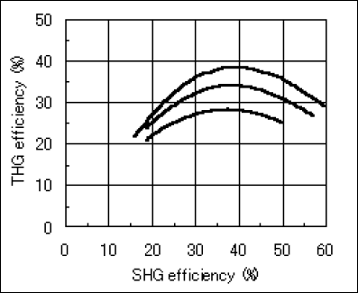 In the calculation, we assumed that both temporal and spatial distribution of the initial fundamental were gaussian. We neglected any dephasing effect, walk-off and diffraction. Figure 5 illustrates the dependence of the THG conversion efficiency on the SHG efficiency as a parameter of peak intensity of initial fundamental, obtained by integrating the calculated distributions with respect to both time and spatial coordinates. The results agree well with the experimental results in terms of the optimum SHG efficiency.