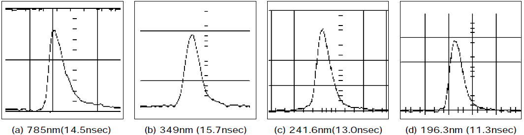Figure 8. Measured pulse shapes of Ti:sapphire, THG, first SFM, and second SFM (10ns/div).