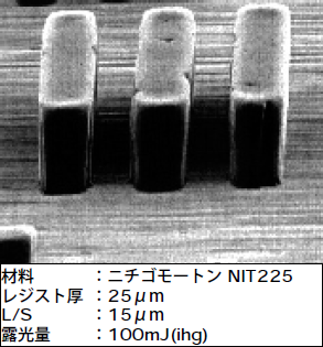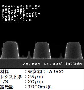 弊社露光装置で処理した場合の解像力例として各種感光材を投影露光で処理した場合のSEM写真を以下に紹介する。