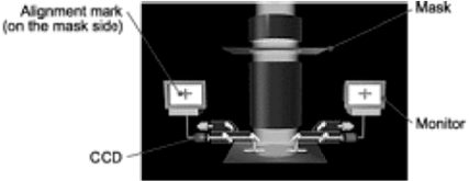 弊社装置のアライメント方式は非露光波長TTLオンアクシス方式を採用している。通常投影レンズは露光光により解像力が得られる(収差の補正)よう設計されている。このため従来はアライメント光として露光波長を部分的に照射するかオフアクシスアライメントが用いられる。露光波長を使ってアライメントする場合はアライメント時にアライメントマーク周辺が露光される不具合が発生する。解像力の要求が低い場合は露光波長と非露光波長(一般的には546nm)の2線で収差補正を行っている投影レンズを使用することも考えられる。しかし、要求性能が高解像力化並びに大面積化するに伴いこの方式は適用できなくなると考える。非露光波長オンアクシスTTLアライメント方式はこれらの問題を解決する方式として有効である。以下に弊社方式について説明する。