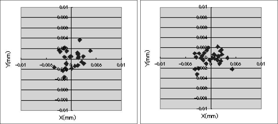 露光処理時に得られたログデータから推定したアライメントマーク部でのバラツキは2.3~2.6µm(3σ)であった。これに対して実際の露光結果を測定したバラツキの測定結果は3.9~5.2µm(3σ)であった。実ワークの測定結果は測定再現性のバラツキとマーク個々のバラツキも含んだ数値である。従ってログデータから得られたバラツキより大きい数値となっているものと考える。