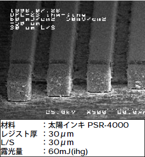 解像力はドライフィルムレジストの最小解像線幅で規定される場合が多い。しかし、実際の処理ではフォトソルダーレジストや感光性絶縁材が使用される場合も多い。